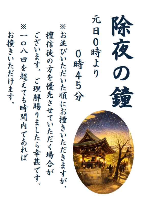 午前0時から撞き始め、0時45分頃終了となります。