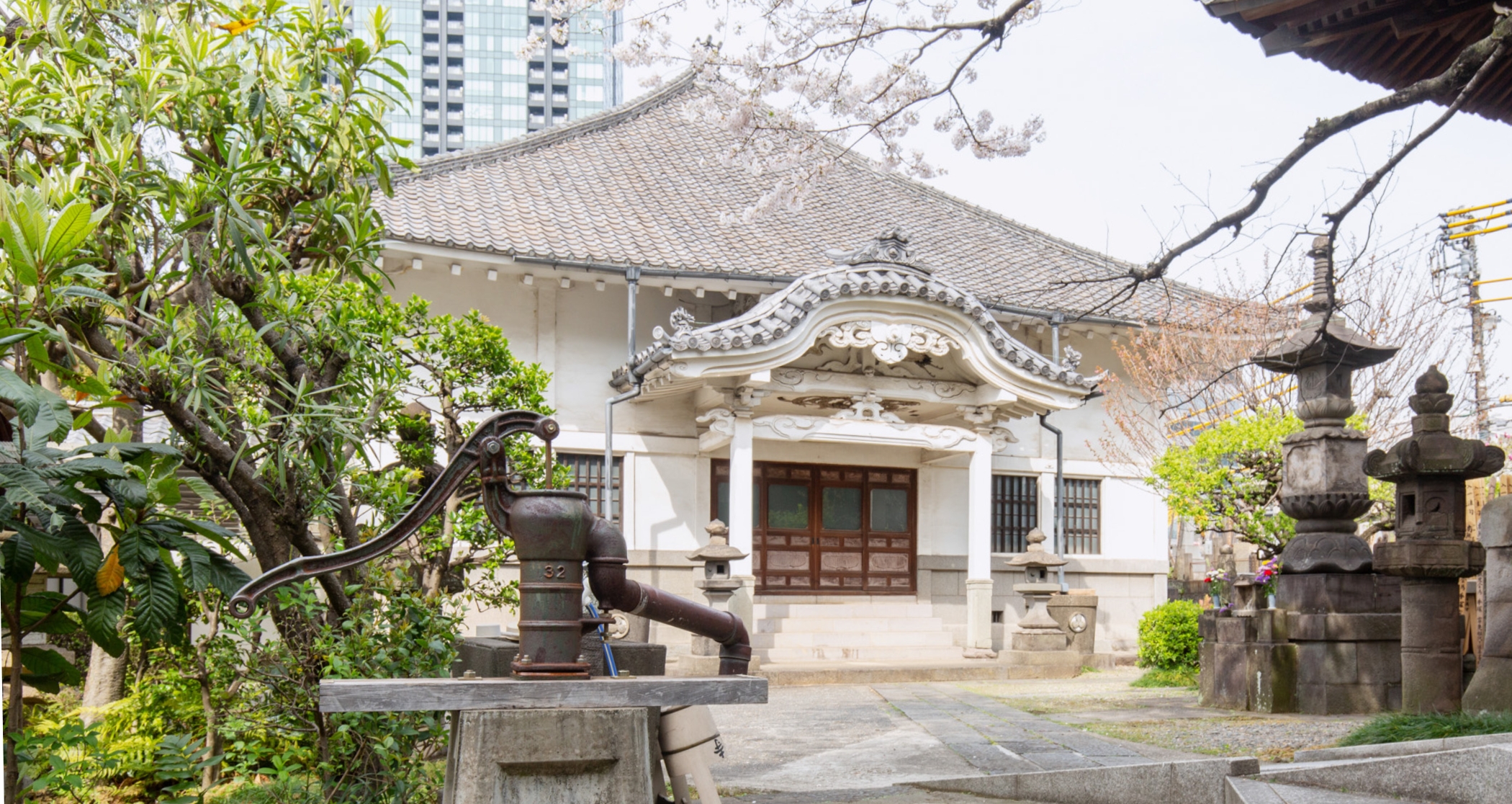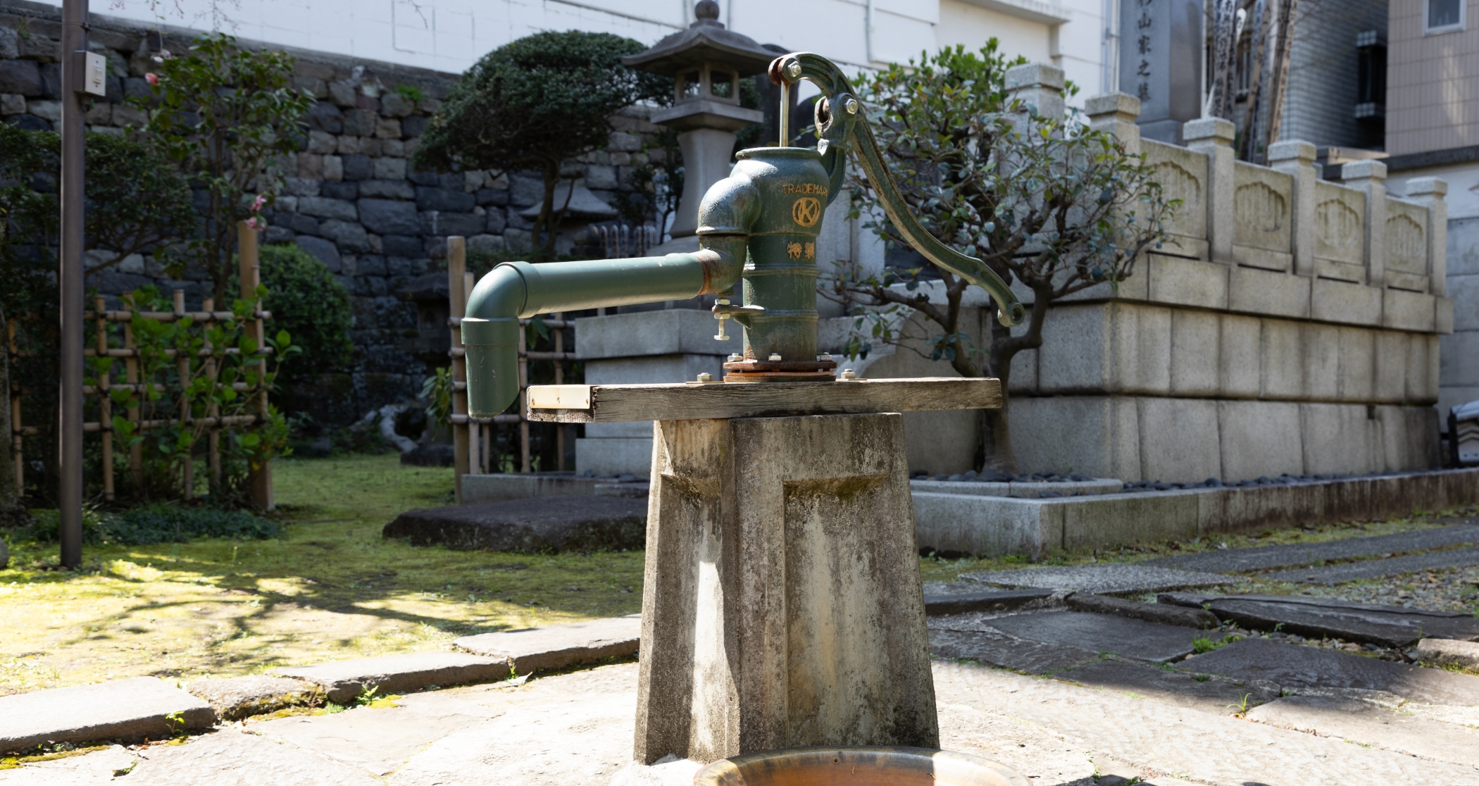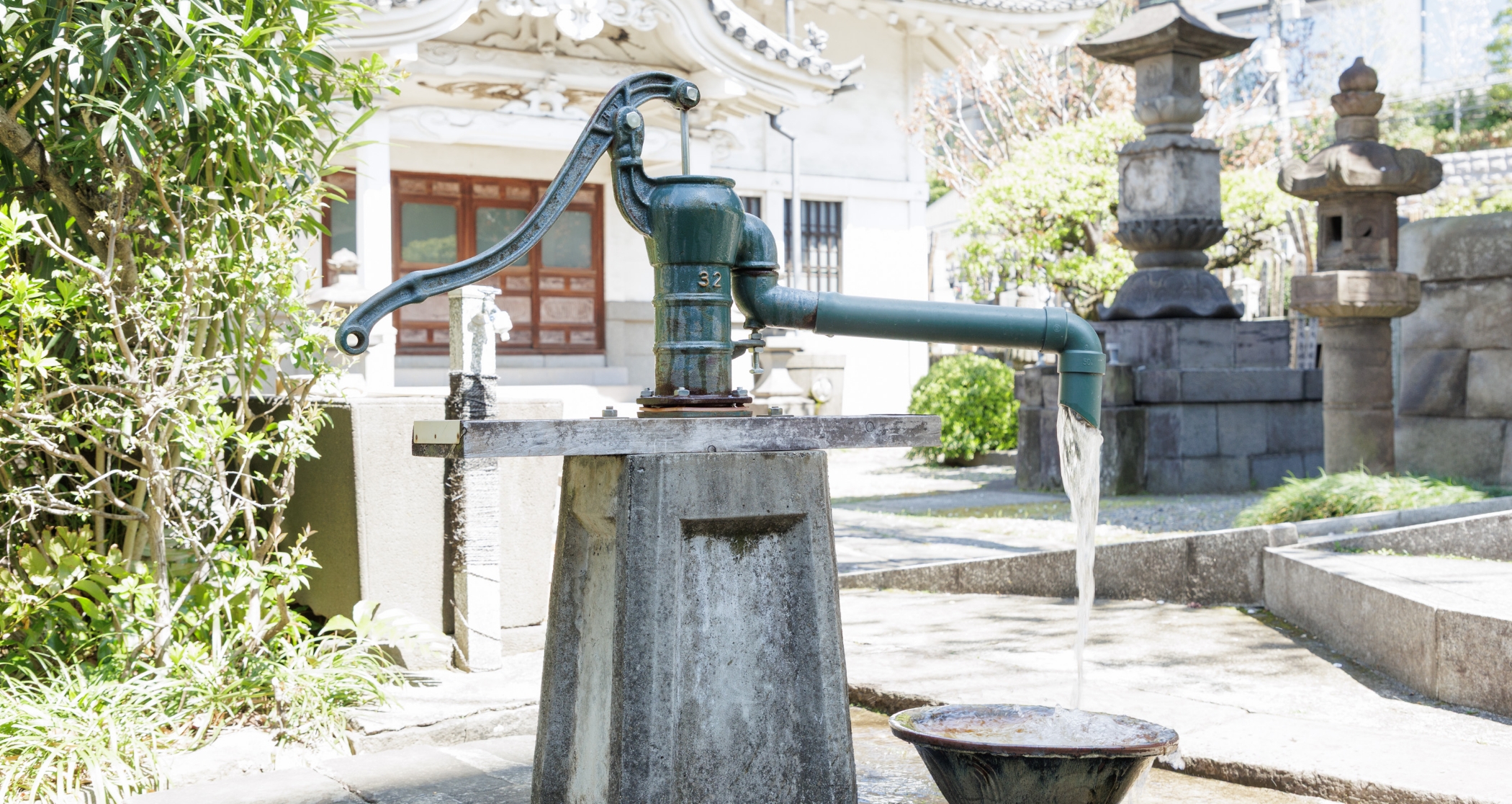 龍原寺の山門を抜けた先には昔ながらの手漕きポンプ(慶和製作所製)の井戸があります。井戸からは、今もなお枯れることなく透明な水が湧き出ています。昔ながらの風景を残しながら、何世代も受け継がれてきた井戸の水。寺院を訪れるお檀家の方々には、お墓参りの際など日常的にご利用いただいています。