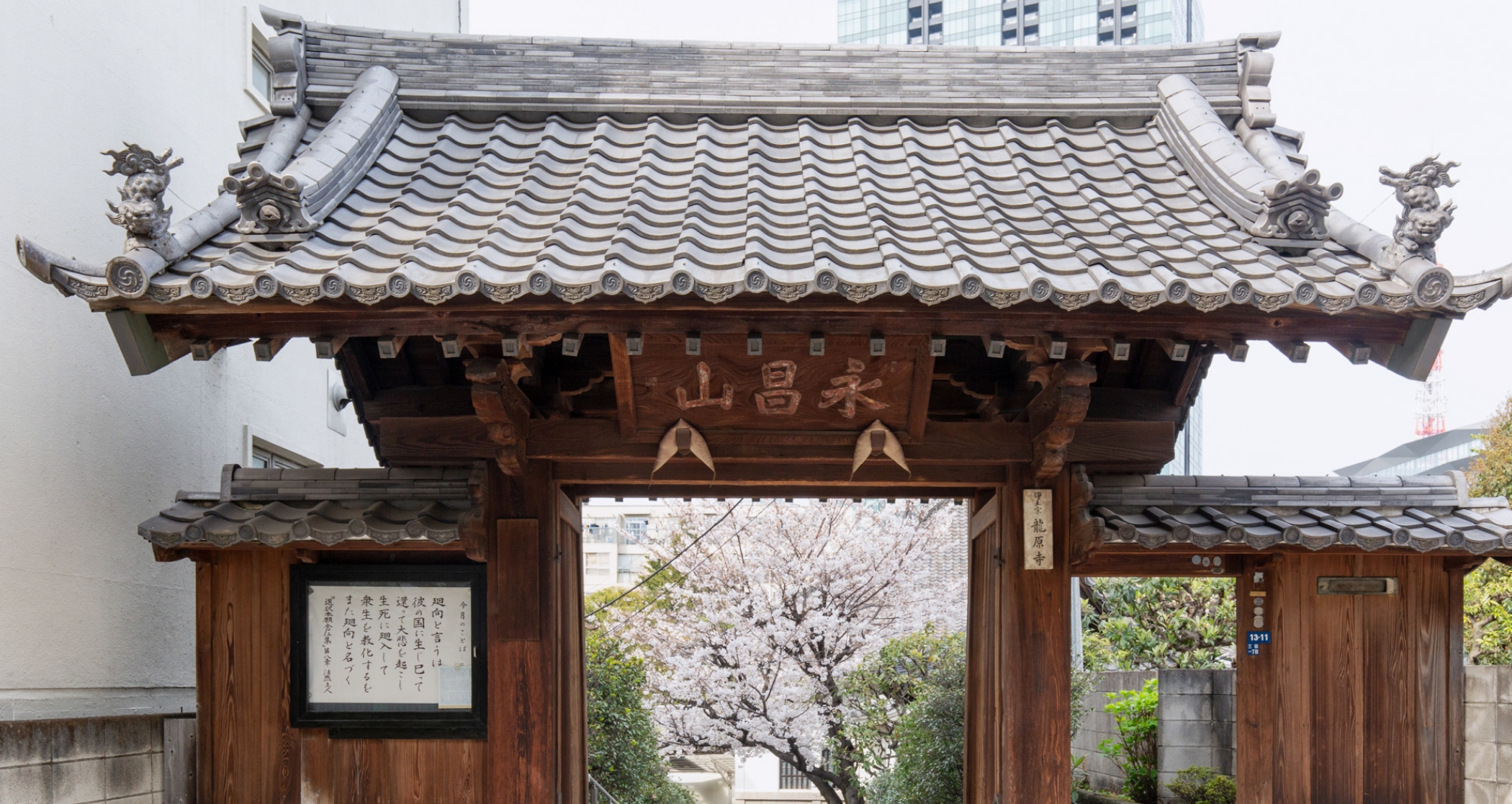 江戸期築、龍原寺の中で最も古くからある建造物です。弘化二(一八四五)年の青山の火事でも焼失せず、二百年の歳月を経てその姿を今に遺します。趣きのある風情を湛えながら、神明坂へ直結する裏門として、今でも檀家の方々に利用されています。