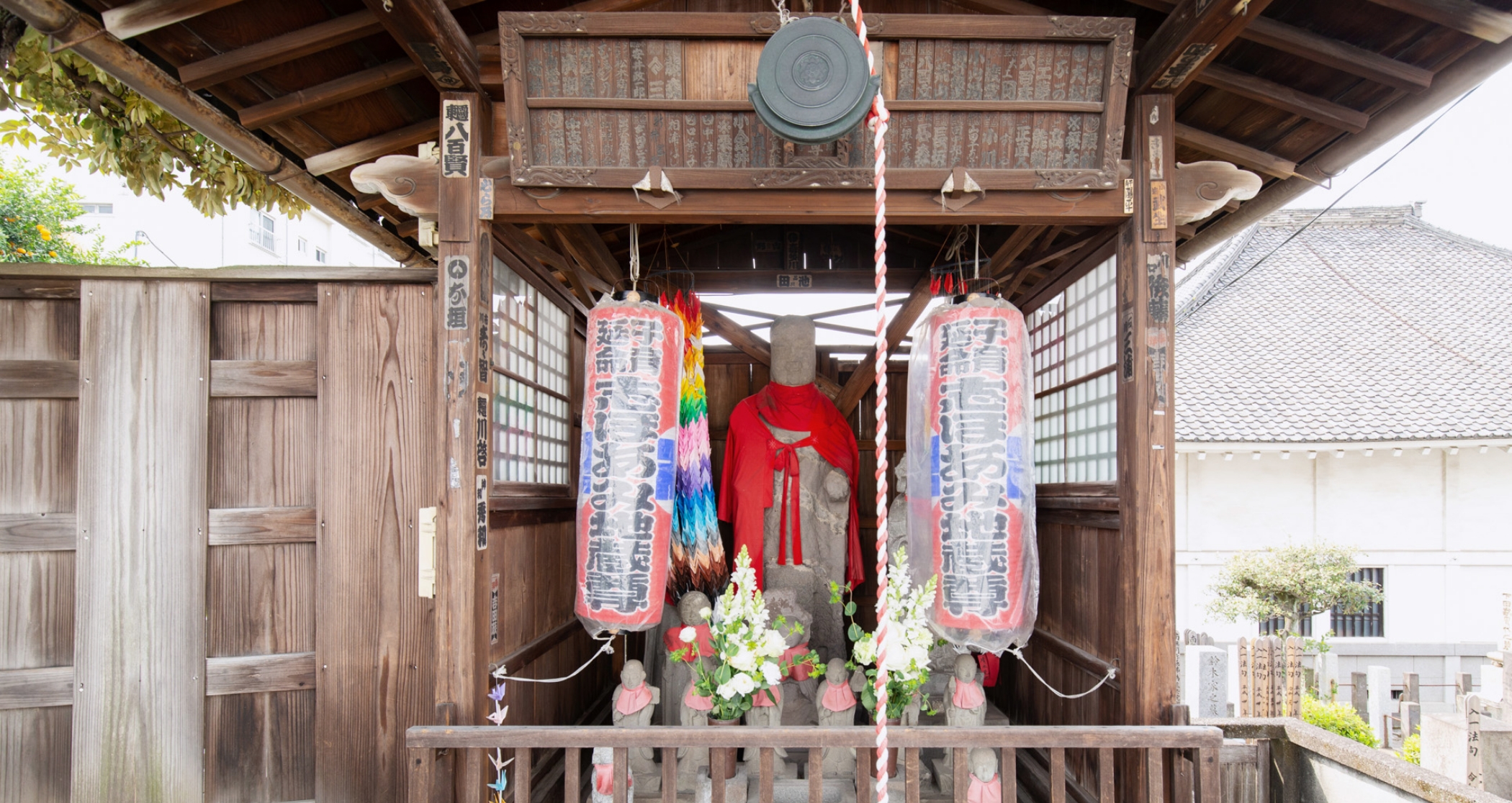 寛文五(一六六五)年の龍原寺の三田への移転の際、共にこの地に引っ越してきたました。以前は境内に安置されておりましたが、昭和二八(一九五三)年に道路に面した場所に遷座(移設)したため、現在では子育て・延命のお地蔵様として近隣の方にお参りいただいております。