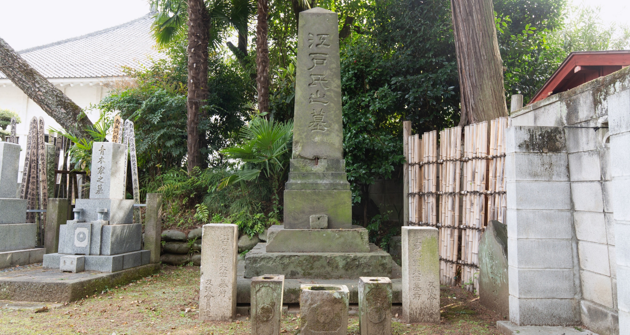この墓は明治二十四(一八九一)年、増上寺塔頭の貞松院から移したものです。天文五(一五三六)年は太田道灌が歿してから五十年目に当たり、当時の江戸は北條氏綱の治めるところでした。この江戸氏の墓が、かつて武蔵国の大福長者として君臨した江戸太郎重長の末裔か、またはその一族の墓であるかは調査の手がかりがありません。