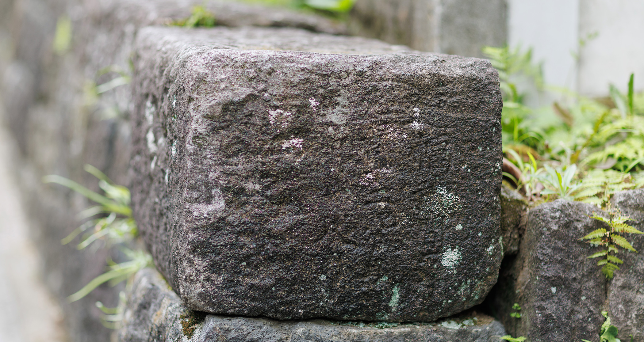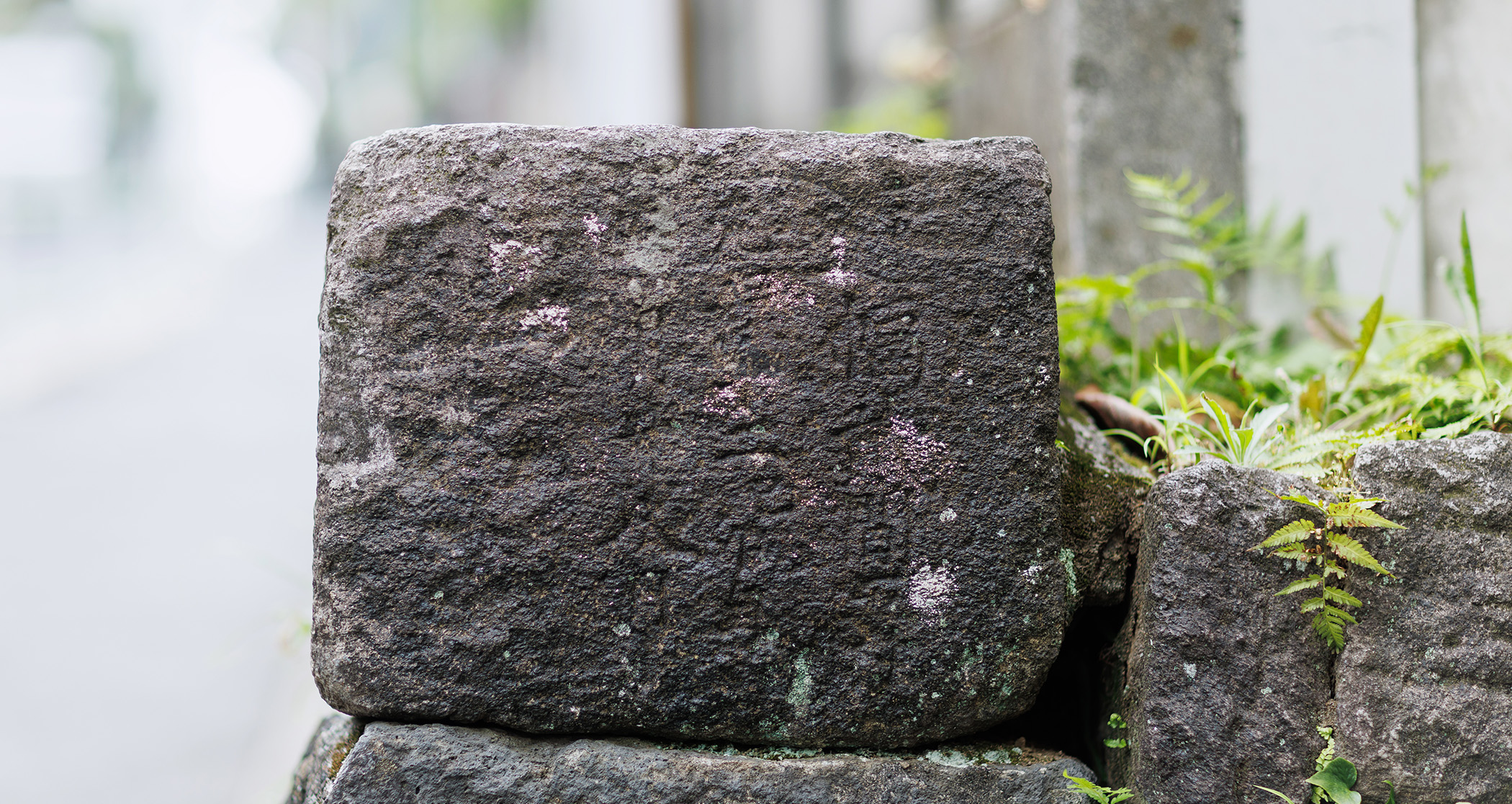 この石標は龍原寺の裏から長久寺へ曲る角にあります。標に「道幅貳□五□元禄十二己卯年五月廿八日」と刻まれています。慶安元(一六四八)年、大中寺がこの角に移ってきて、寛文五(一六六五)年には龍原寺が八丁堀から移転しました。つづいて、長久寺、当光寺、円徳寺などの寺院が建立されて、寺院町が形成されるに至りました。その初期の境界を示す遺跡かと思われます。