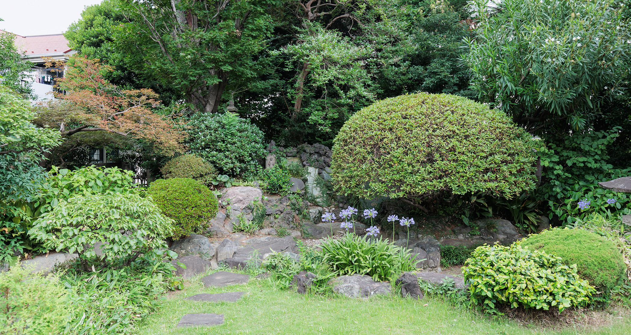 日本式のお庭に人工的に築かれた山のことを「築山(つきやま)」と言います。龍原寺の築山からは自然豊かな庭園と木造平屋建てのお座敷、土蔵造りの本堂などを一望するができます。都会の中でも穏やかな自然を感じることができる、心和ませる風景です。