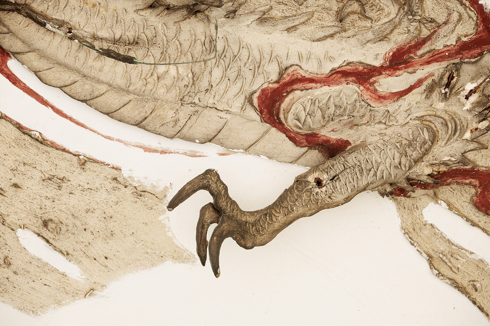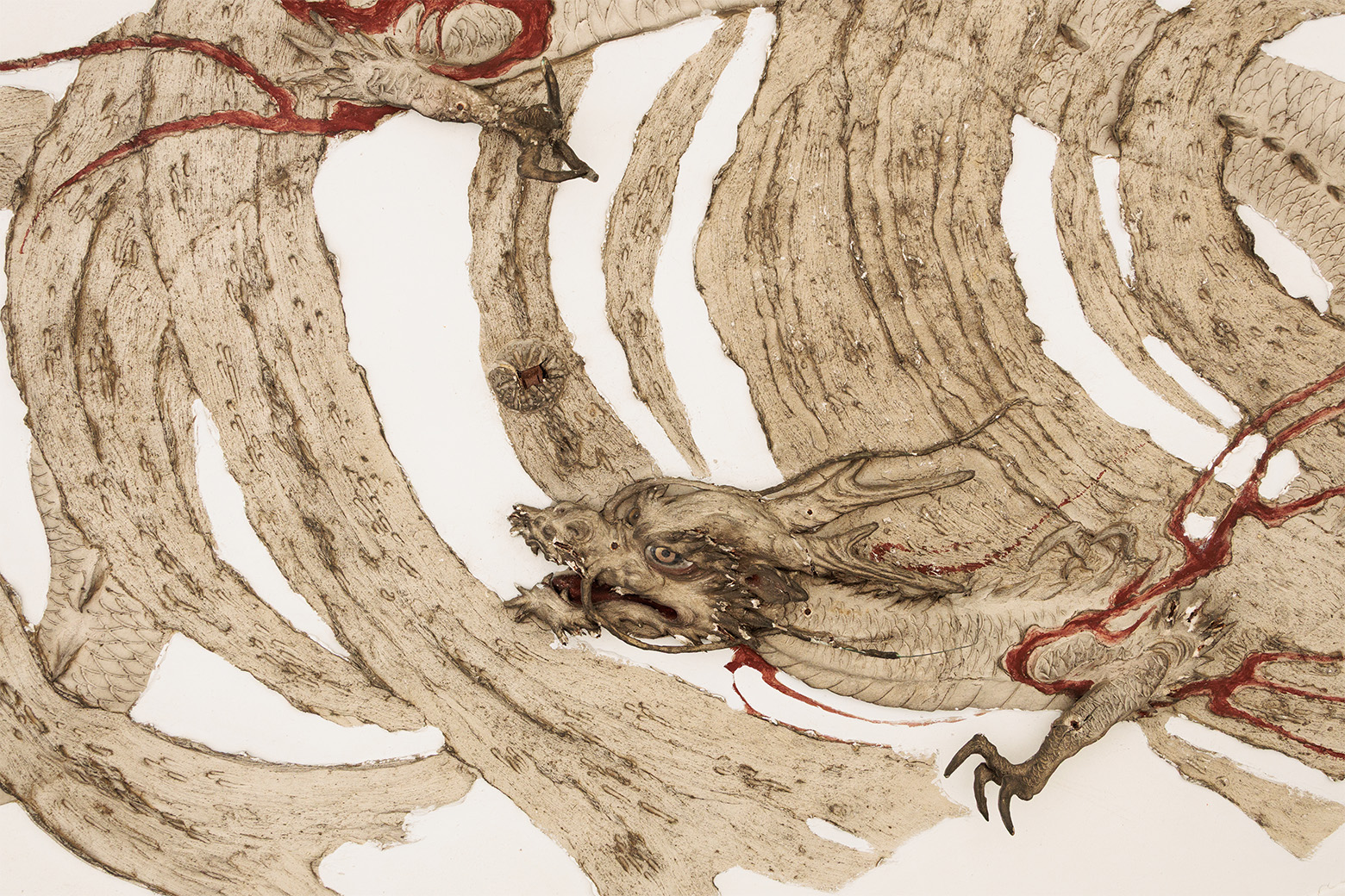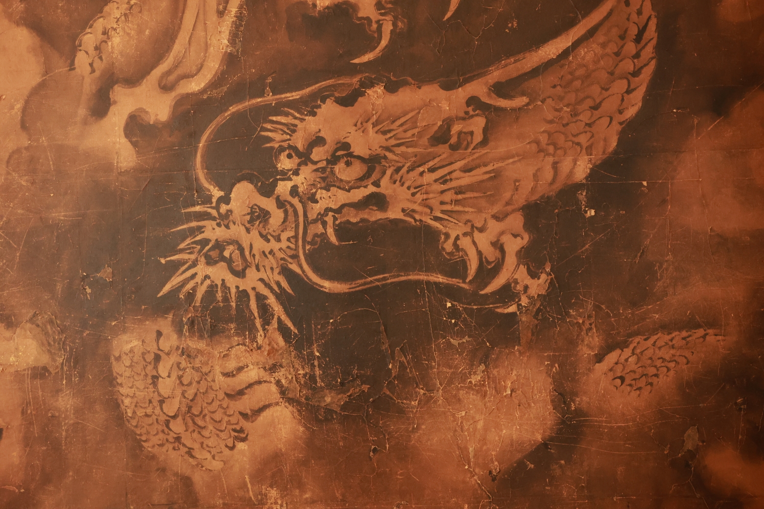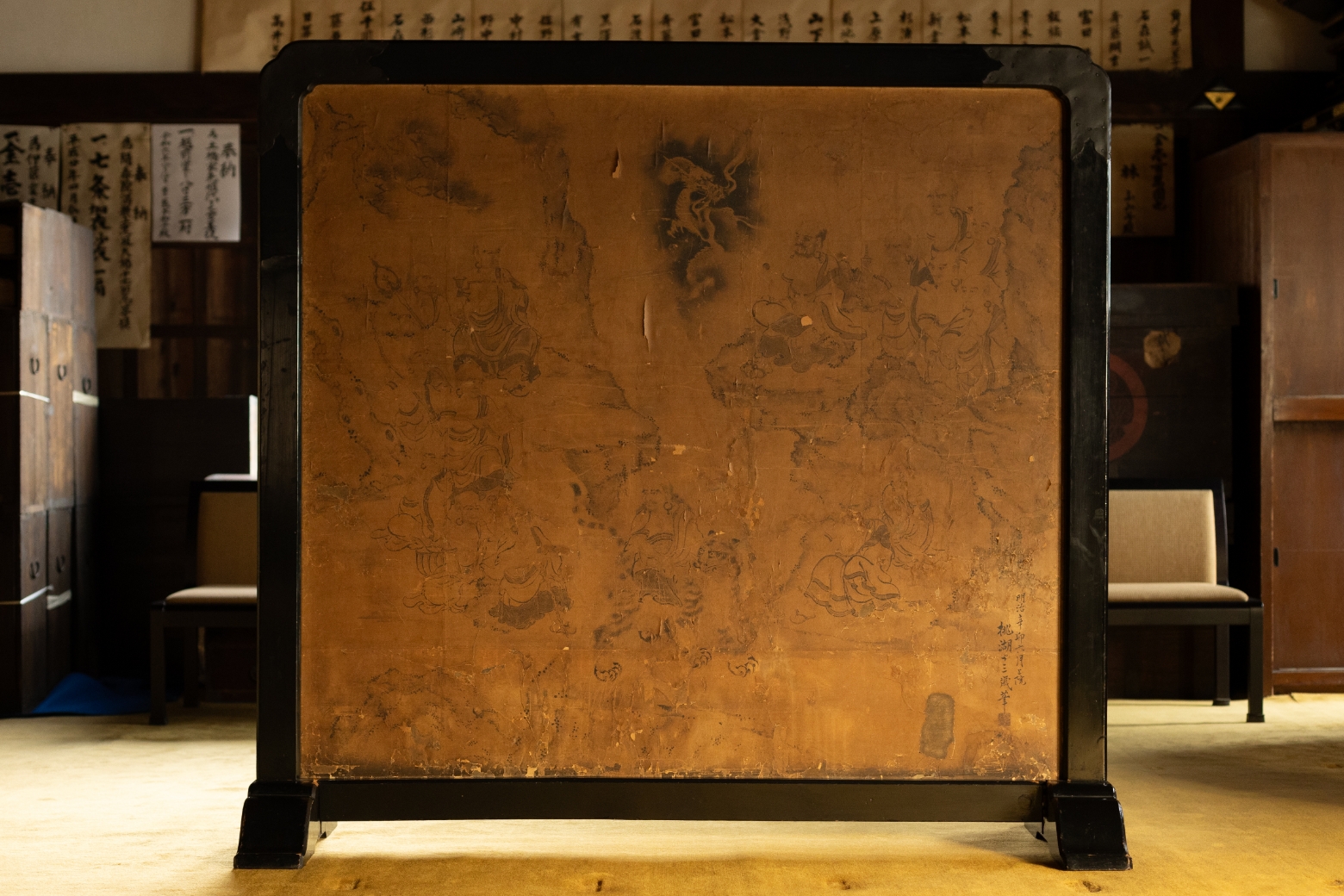 雲龍図衝立は、表面に一匹の龍を大胆に配しながら、裏面では同じ龍を上空に飛翔させ、僧侶や虎と共にひとつの世界観を描き出しています。