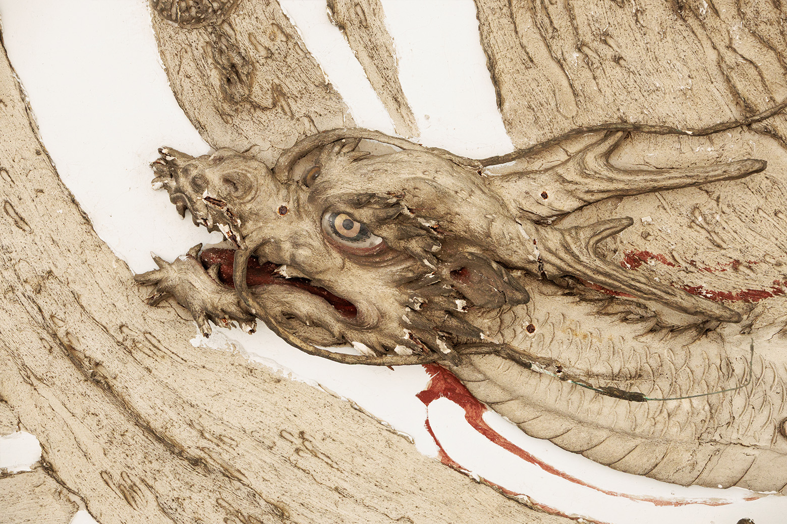 弘化三(一八四六)年に建立された龍原寺本堂は、寺院としては珍しい土蔵造りの本堂です。これは、大火が頻出していた江戸時代後期において、延焼防止に配慮した建築様式と伝わります。また、向拝や内部には、左官による美しい具象彫刻や漆喰彫刻が施されていることも特徴です。
