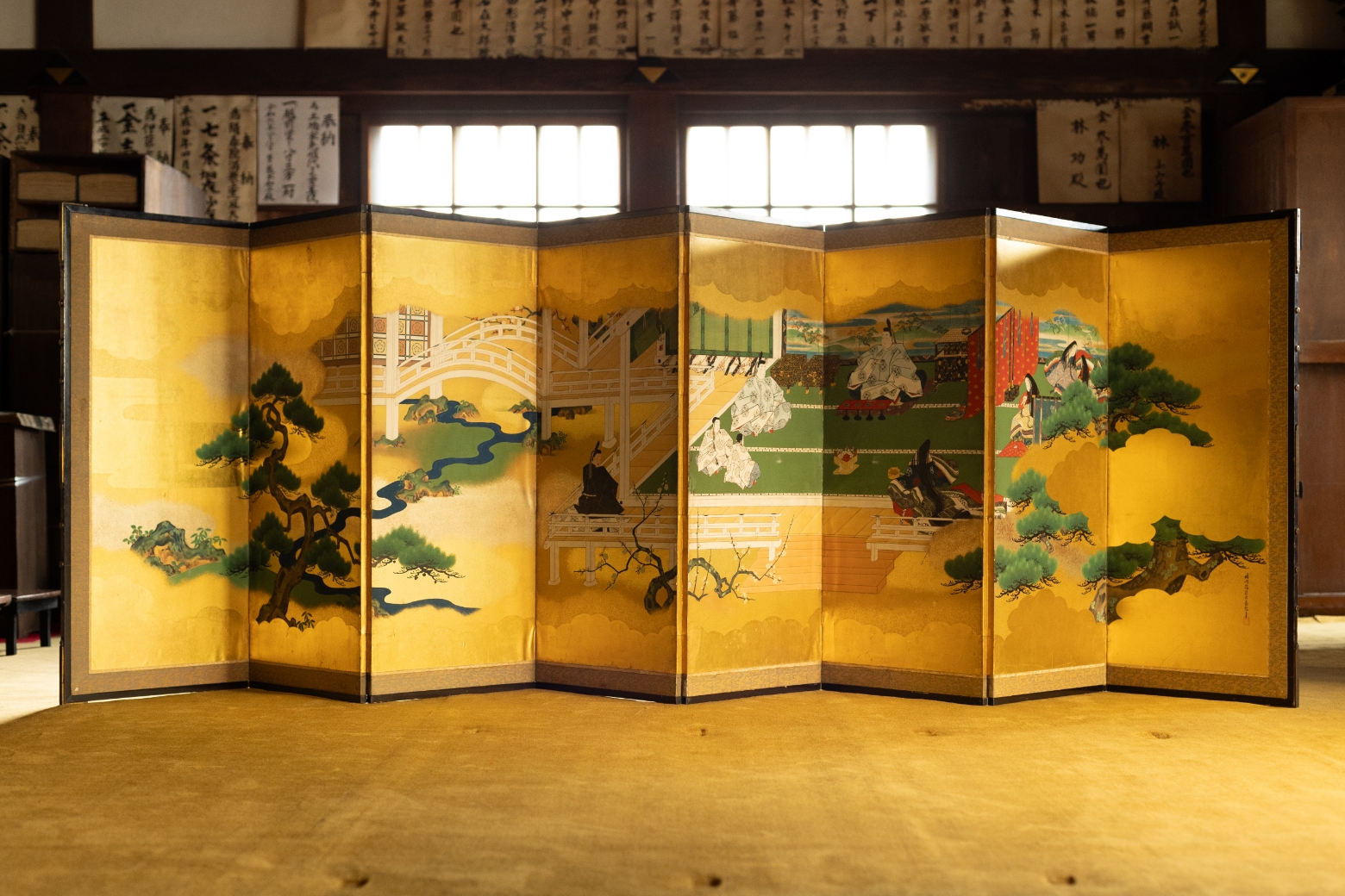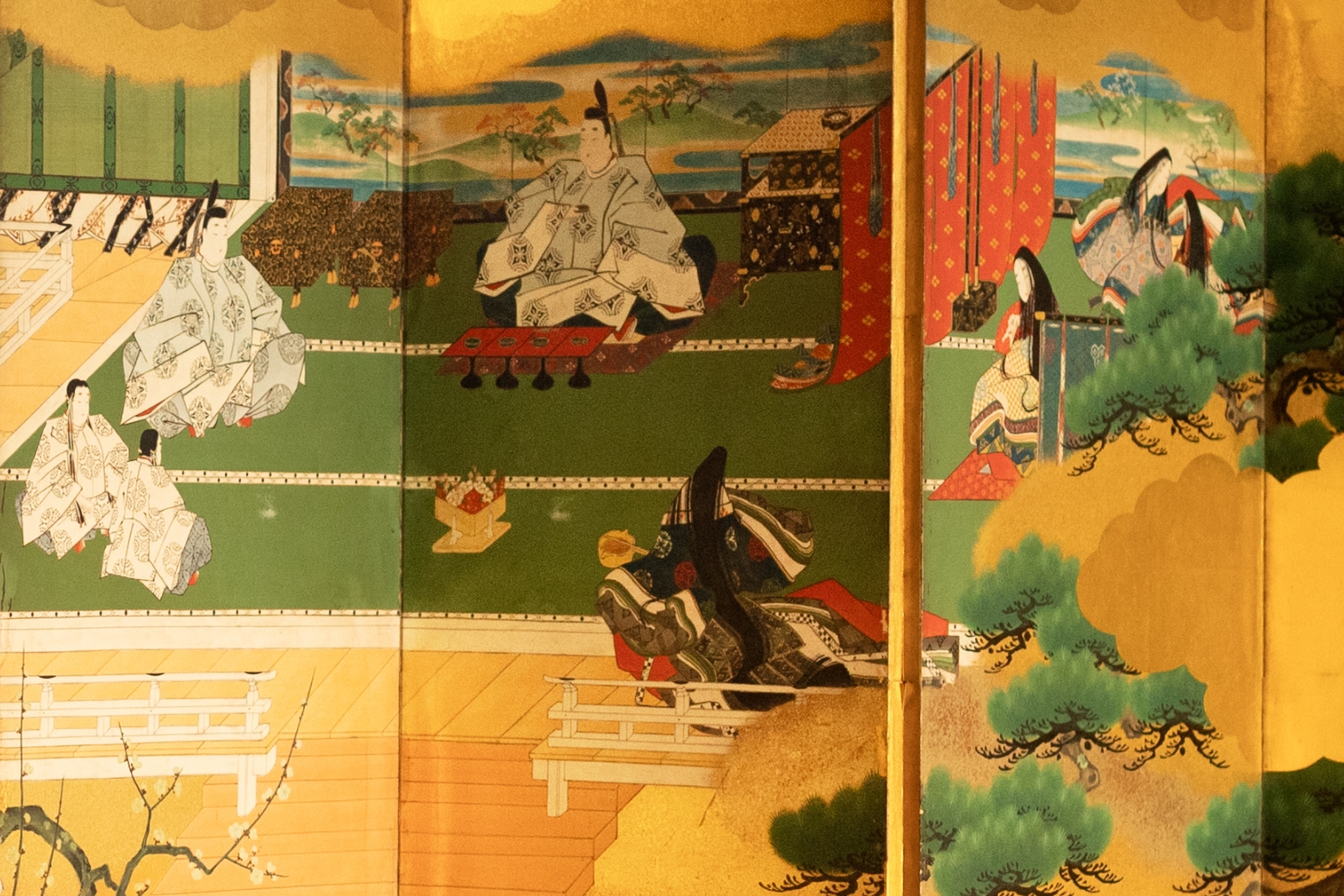 狩野晴川院養信は、江戸城西の丸御殿や本丸御殿障壁画制作の総指揮を執るなど、奥絵師である狩野派の最後の大家と評されます。養信は婚礼調度品として源氏物語屏風を多く制作しており、本作でも着物や調度品など細部に至るまで華やかに描かれ、絢爛豪華な屏風図に仕上げています。