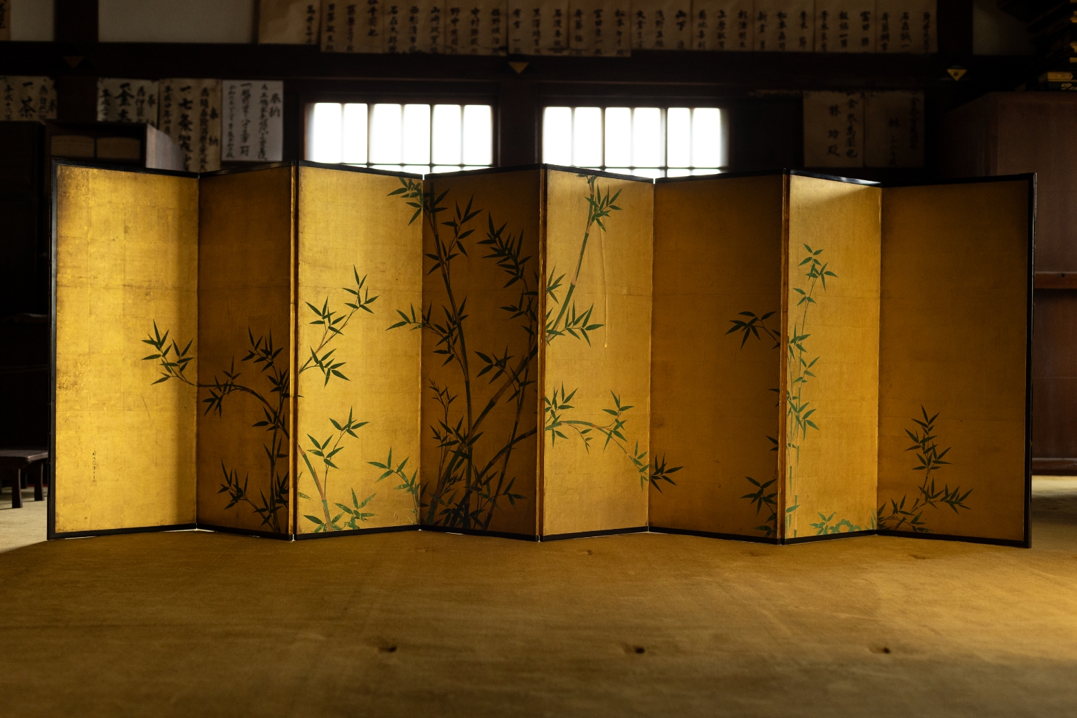 清々しい竹の緑青が総金地に映える優雅で爽やかな竹図屏風です。