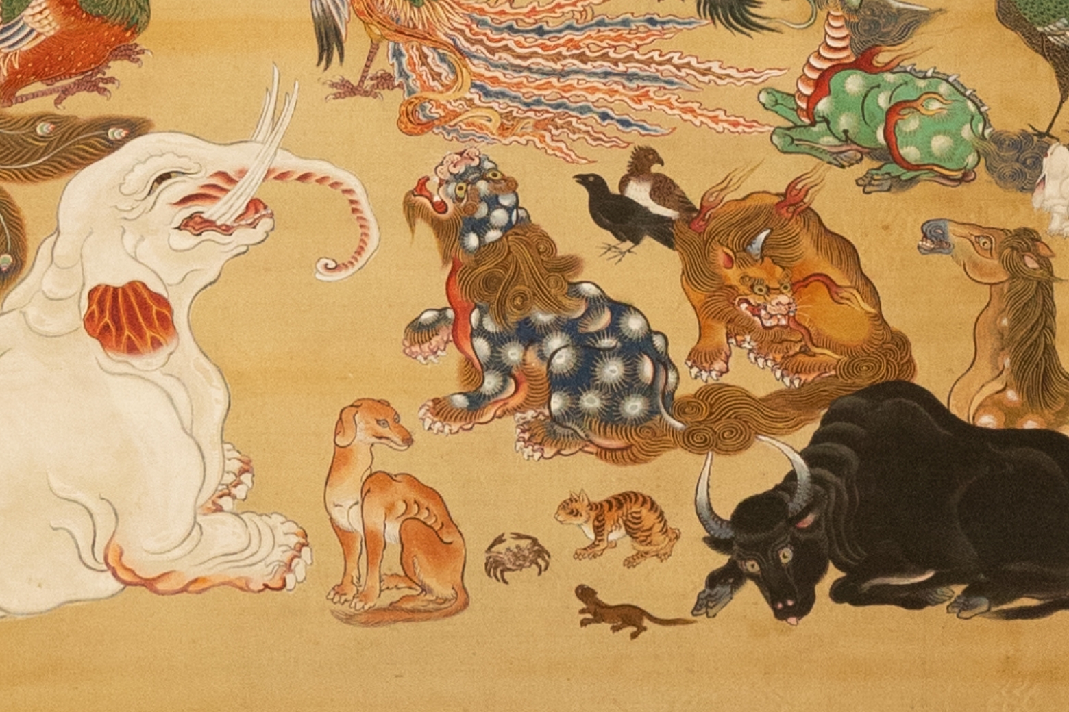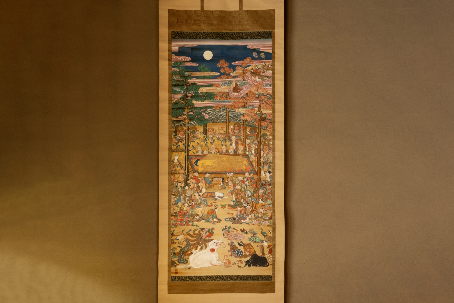 お釈迦様が入滅した時の情景を描いた図で、入滅されたことを「涅槃に入る」と言うことから涅槃図と言われています。横たわるお釈迦様の周りには様々な菩薩や神々、人間や諸動物までもが駆けつけお釈迦様の死を悲しんでいます。多くの動物が描かれますが、猫は珍しく希少性が高いと言います。この涅槃図では、右下部に虎柄の猫が座っています。