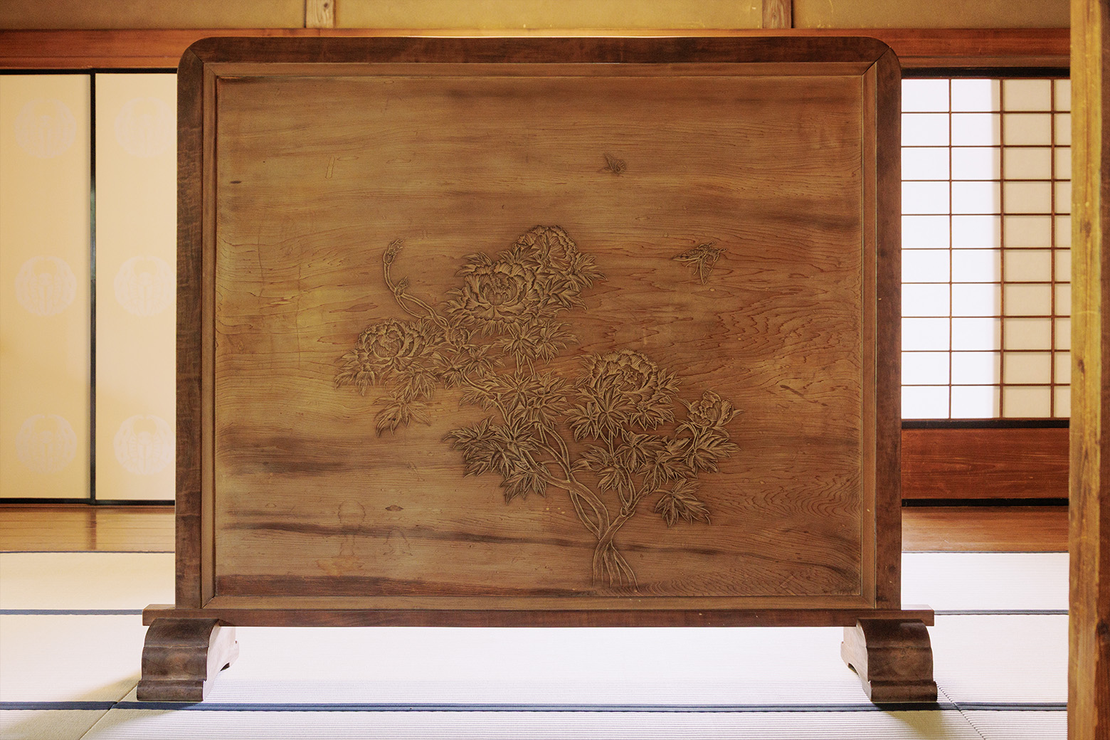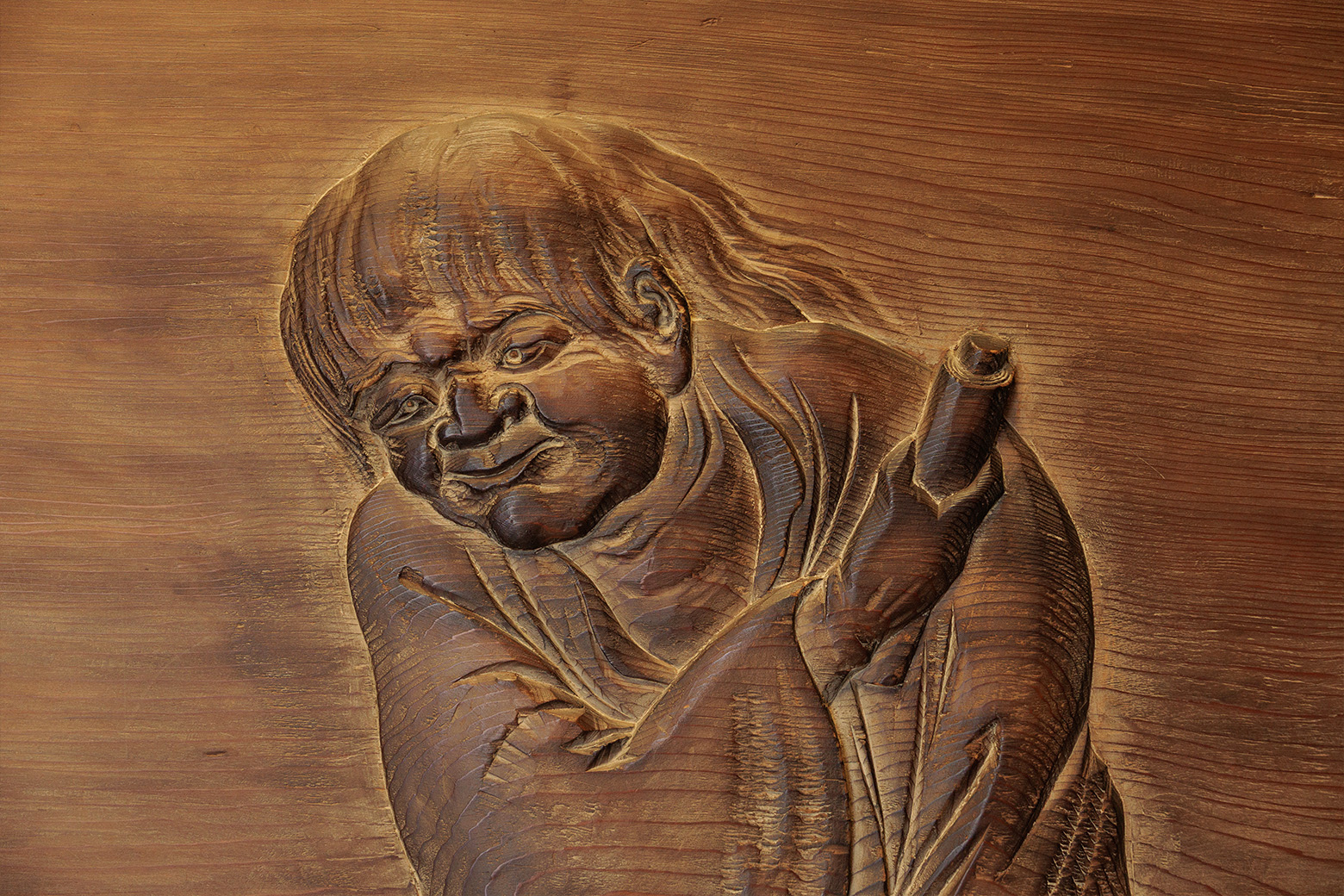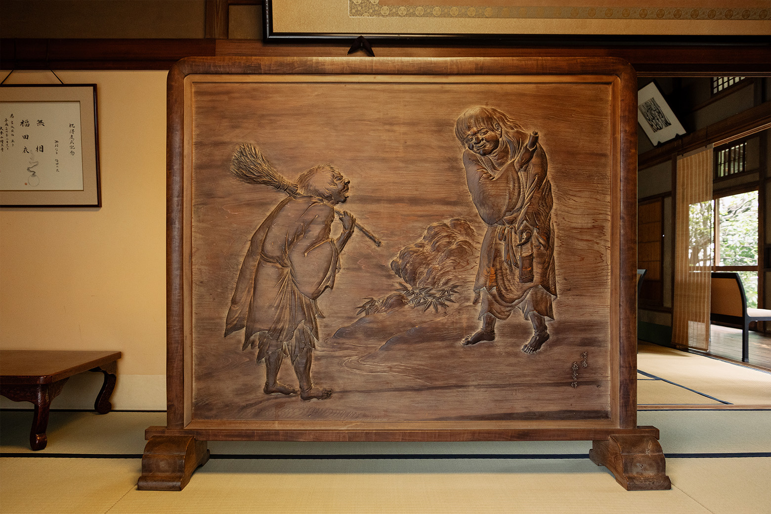 寒山と拾得を彫刻した衝立。寒山と拾得は中国の唐代に実在したとされる伝説の詩僧です。詩作に耽る一方で、世俗を超越した奇行ぶりは人々に特別視され、いつしか寒山は文殊菩薩、拾得は普賢菩薩の化身とする説が生まれました。二人はとても仲が良く、いつも一緒に遊びまわります。この衝立も、寒山と拾得の楽しいやりとりが聞こえてきそうな、いきいきとした息遣いが感じれる作品です。